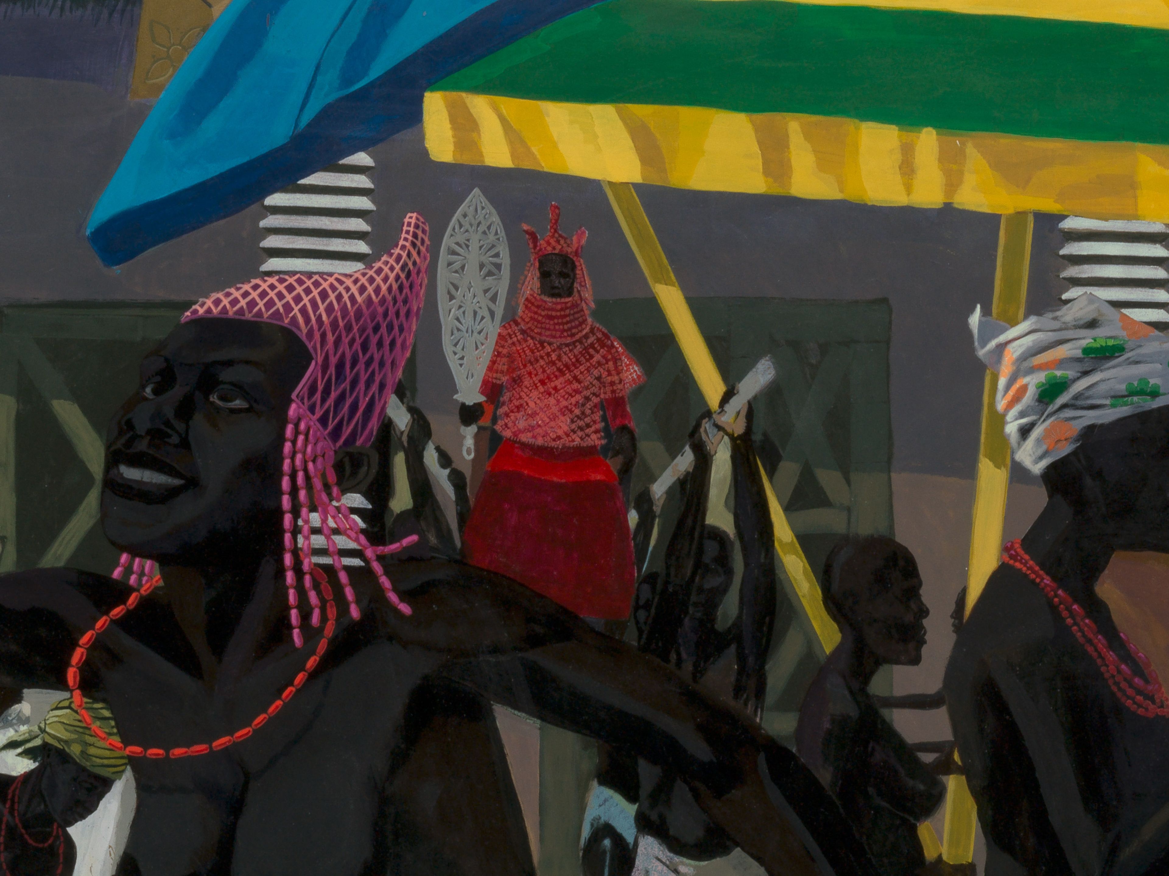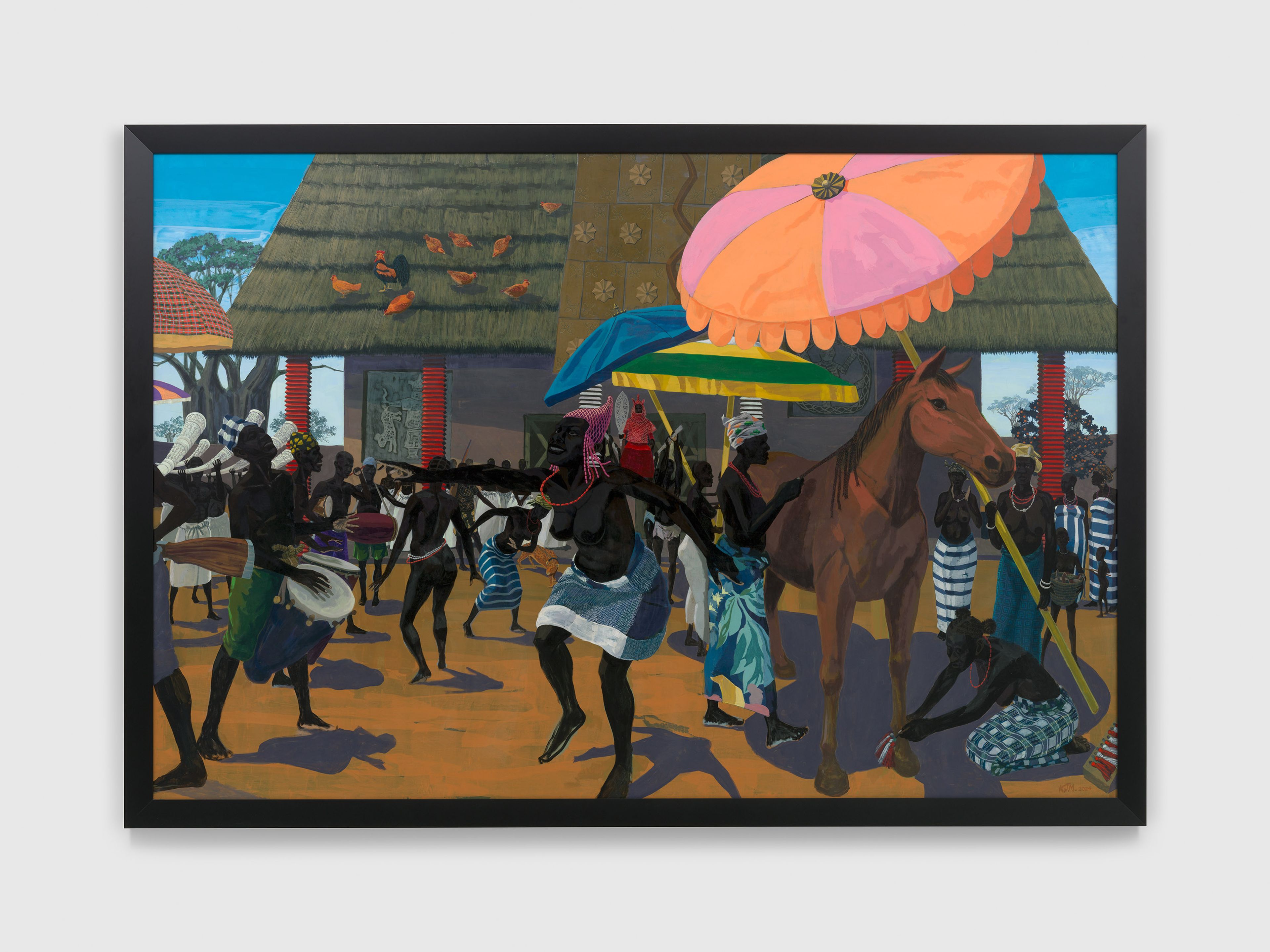 As his point of departure for this imagined scene, Marshall uses a line found in a European slave trader’s journal (referenced in the artwork’s title): “They used to give 12 men for one horse. Now they only want to give 6.” Indeed, a large horse stands regally in the foreground of the painting, presumably acquired in exchange for six people. A gaggle of attendants fawn over the animal, shielded from the hot sun by a colorful umbrella reminiscent of the parasols prevalent in nineteenth-century depictions of bourgeois leisure. (European horses were not well suited to the climate of West Africa.) Several people dress the horse, braiding its mane and tasseling its hooves, while a small child waits nearby, holding the reins in a basket. By contrast, the oba, or chief, is relegated to the background of the composition, and appears diminutive. Marshall emphasizes the collision of African and European cultures throughout the composition, evident in the activities and appearances of the range of individuals he depicts, as well as the architecture. The space of the painting is grounded by a large rectilinear structure in the background, its thatched roof dotted with chickens and framed on either side by the low trees native to the region. The oba appears on the building’s portico wearing a red cassock, an indicator of the arrival and adoption of Christianity—and a sign of not only Western goods, but also ideology, being imported. Behind him, two large bronze plaques (made by melting down the Portuguese currency paid for slaves) punctuate the façade and feature imagery emblematic of the oba’s power. A leopard and a rifle-wielding sentry patrol the ground in front of him. Throughout this body of work, the artist borrows numerous compositional and perspectival strategies from Renaissance and neoclassical painting—styles that have crucially informed the Western tradition and are noted for their illusionistic treatment of space—and uses them to question the ways in which history is constructed. In the center of the painting, a single female figure dances gleefully, arms outstretched in revelry. Her pose and positioning echo Jacques-Louis David’s The Intervention of the Sabine Women (1799), another history painting that depicts the consequences of a mass abduction. To the woman’s left, a cavalcade of drummers and revelers contribute to the festive atmosphere, as do five individuals who hold aloft horns made from carved ivory elephant tusks—rarified and valuable objects they have chosen to keep rather than barter as a sign of respect for the oba. The composition, as with each work in this new series, is placed in a black aluminum artist’s frame, calling attention to its status as art-object and acting as a reminder of the constructed nature, as well as untold complexities, of all historical accounts. Moreover, in debuting this series at London’s Royal Academy, Marshall mounts a direct challenge to the hegemony of the West in constructing and upholding the dominant historical and art-historical narratives, which frequently gloss over any involvement with slavery. Yet, in Six for one, the slave trade is referenced only obliquely, and Marshall instead shifts focus to how its introduction affected African society, pushing it towards a Western idea of modernity. As Darby English elaborates: “Folding slavery into a larger story suggests, not coyly, that we have a larger story. This episode concerns the desires slavery aroused in some Black people. As Marshall says, it opens ‘a more realistic view of what we are willing to do to each other in order to get some stuff.’”
