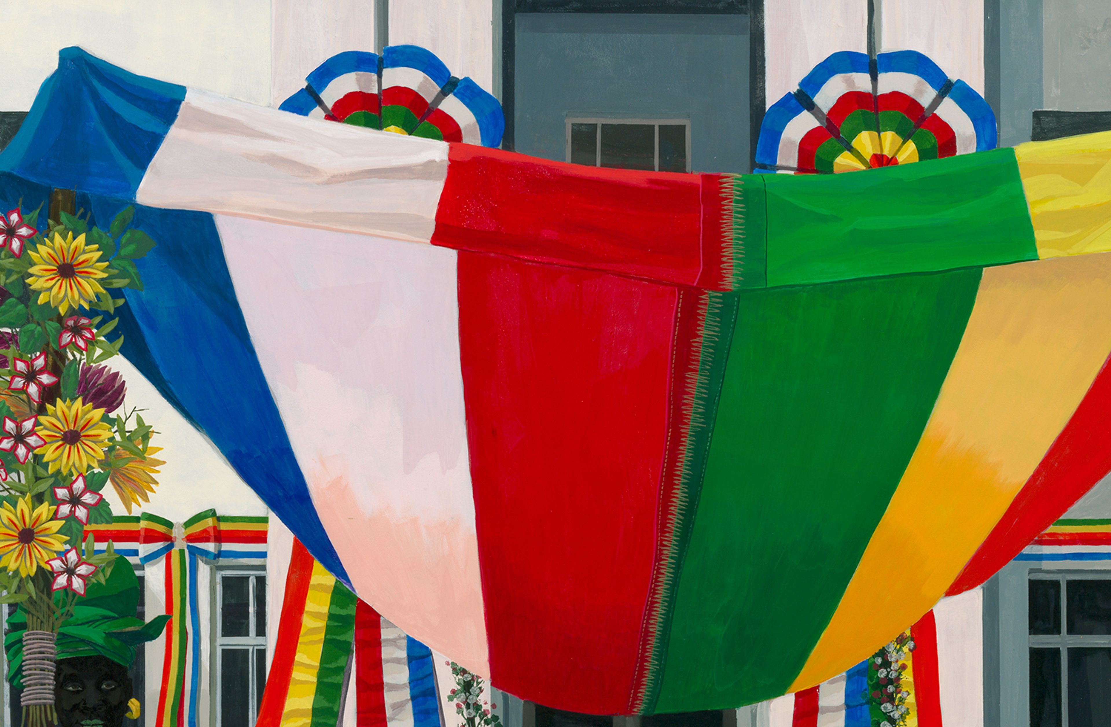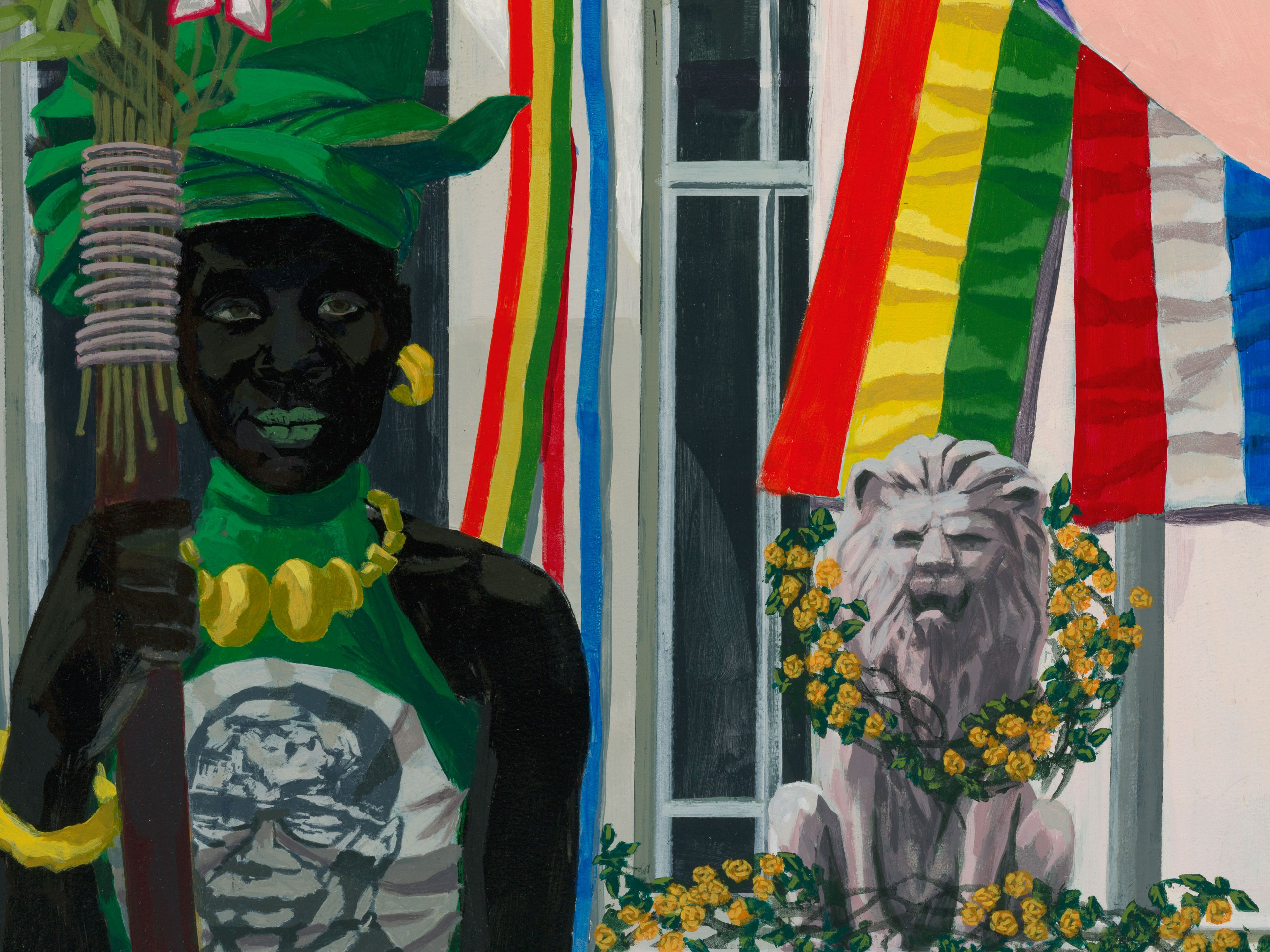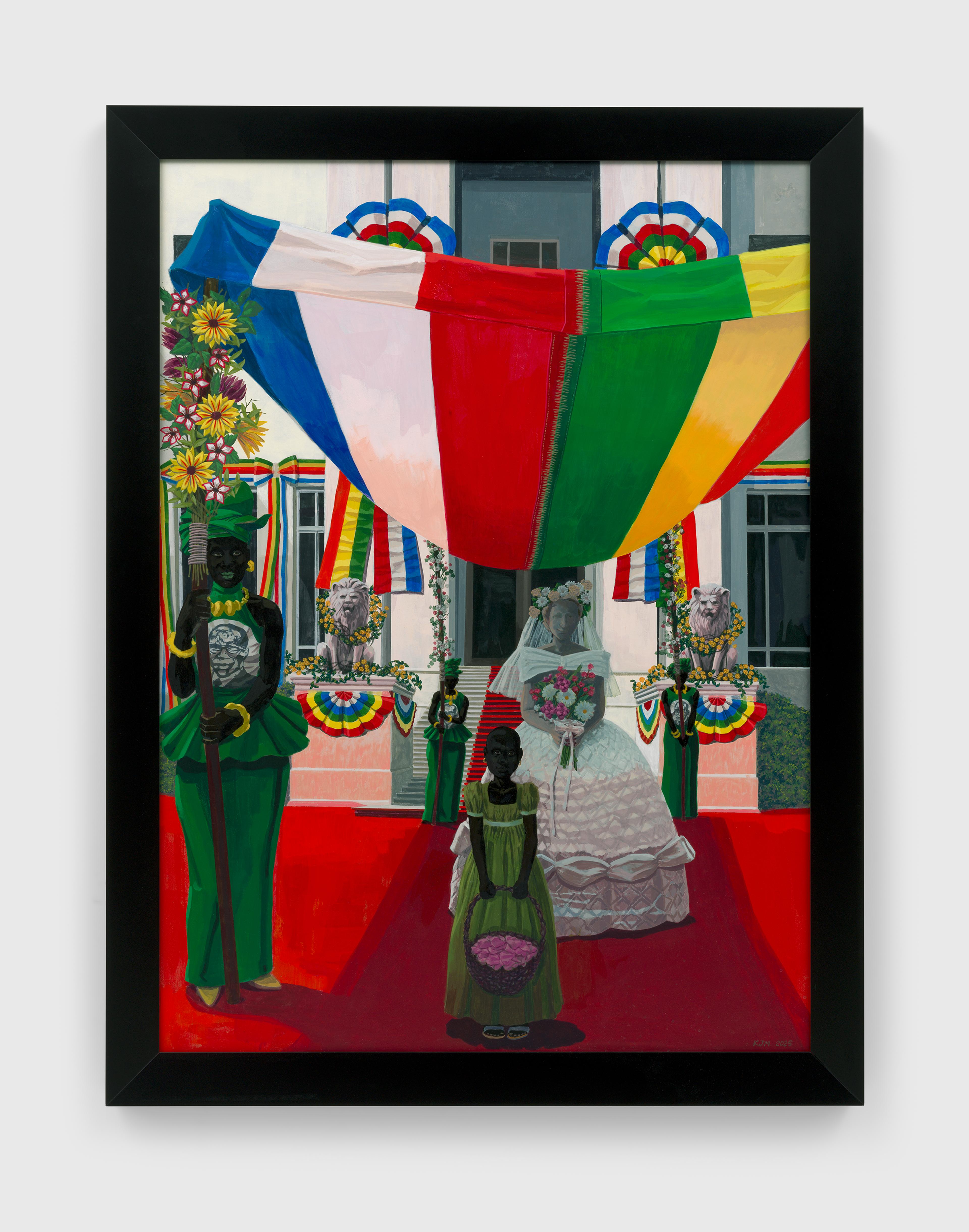 White Queens of Africa: Colette imagines the wedding portrait of Colette Hubert (1925–2019), a Frenchwoman who served as the First Lady of Senegal from 1960 to 1980. In 1957, in a small ceremony in France, she wed the Senegalese poet, intellectual, and politician Léopold Sédar Senghor (1906–2001), a staunch advocate of civil liberties in France’s territories in Africa at the time. Notably, Senghor was one of the primary theoreticians of Négritude, a movement among francophone writers and thinkers that advocated for the affirmation of Black cultural heritage and identity, both in colonized Africa and the European diaspora, fighting against the threat of assimilation. Just three years after his wedding to Hubert, Senghor became the first president of the newly independent Senegal. Senghor referred to Hubert as the love of his life; she was both a muse for his literary endeavors and a ballast in his political life. In the painting, Hubert, dressed in full Western bridal regalia, walks alone down a makeshift aisle leading out of the presidential palace in Dakar, led by a single flower girl who gazes out at the viewer. Hubert is veiled by the shadow of a canopy made from French and Senegalese flags that are literally stitched together, held up by attendants wearing green and yellow outfits adorned with Senghor’s face. Of course, Marshall has put Hubert in front of a building that in 1957 she did not yet live in, surrounded by the green, yellow, and red tricolor that had not yet been adopted, in a country where her wedding did not take place. And, as with Ruth Williams, Marshall puts the focus on her presence during this early postcolonial era.