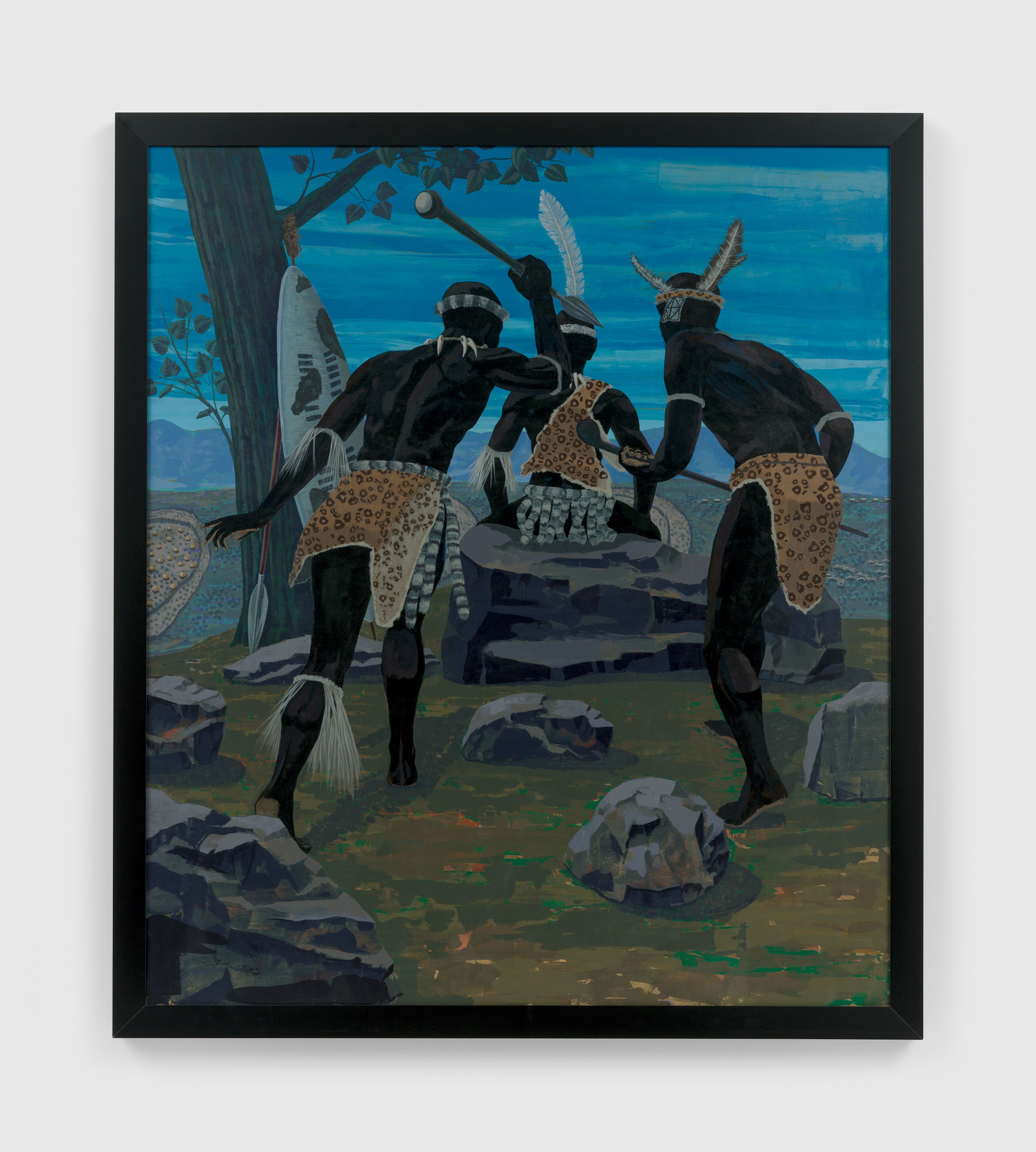 In this painting, Marshall imagines the assassination of King Shaka (c. 1787–1828), the monarch of the Zulu Kingdom in Southern Africa from 1816 until his murder in 1828. A vaunted warrior, Shaka succeeded in consolidating a number of rival clans into a formidable kingdom during his reign. Following a period of increasingly erratic behavior and tyrannical rule in the wake of his mother’s death in 1827, Shaka was assassinated by his half-brothers, Dingane and Mhlangana. His killing was framed as the half-brothers’ attempt to preserve the tribe’s rapidly dwindling dominance and protect its people from a rampaging, grief-stricken king. Over time, King Shaka has been appropriated into cultural discourse and depicted in a range of oversimplified guises, from the stereotypical “noble savage” to a mythical figure. Marshall’s painting captures the critical moment of Shaka’s assassination, the actual details of which are absent from the historical record. (And there is only one known depiction of Shaka from his lifetime, a drawing seen at right.) Shaka gazes over his lands from the edge of a precipice, observing a line of covered wagons approaching the huts of a Zulu village. Entirely focused on enemies from the outside, he does not notice the assailants approaching at his back. The figure on the left brandishes an iklwa, a short spear with a sword-like tip. (One of Shaka’s key military innovations was to outfit his warriors with iklwa and large cowhide shields, a more effective, close-range tactic than the long throwing spears previously favored.) Seconds from striking the fatal blow—and probably changing the course of African history with a single act of fratricide—the figures advance silently while Shaka’s own iklwa and shield rest against a tree beside him. As English notes, with works such as Assassination of Shaka, the Zulu, “Marshall extends the series’ mediation on choices strategically framed as betrayals in order to purify a history that never was, never could be pure.”