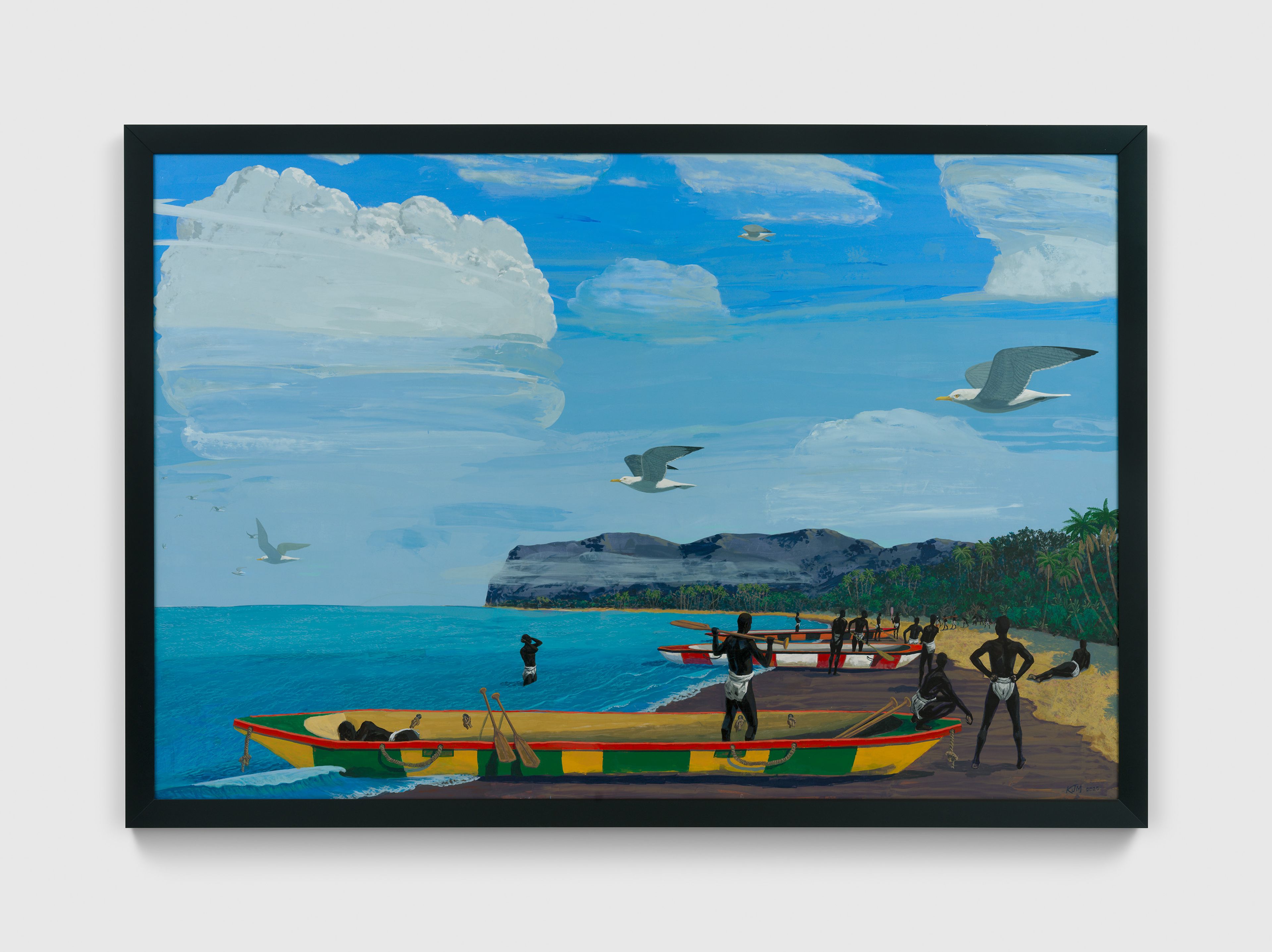 The first painting of the cycle, Cove presents what appears at first to be an unremarkable scene in which several oarsmen loiter around three beached canoes, waiting to embark on their next journey. Apart from one reclining figure—an art-historical trope often used as a signifier of leisure—who lounges in the front canoe, the rest of the men look out towards the distance. There, chained captives are being led single file toward the boats.
