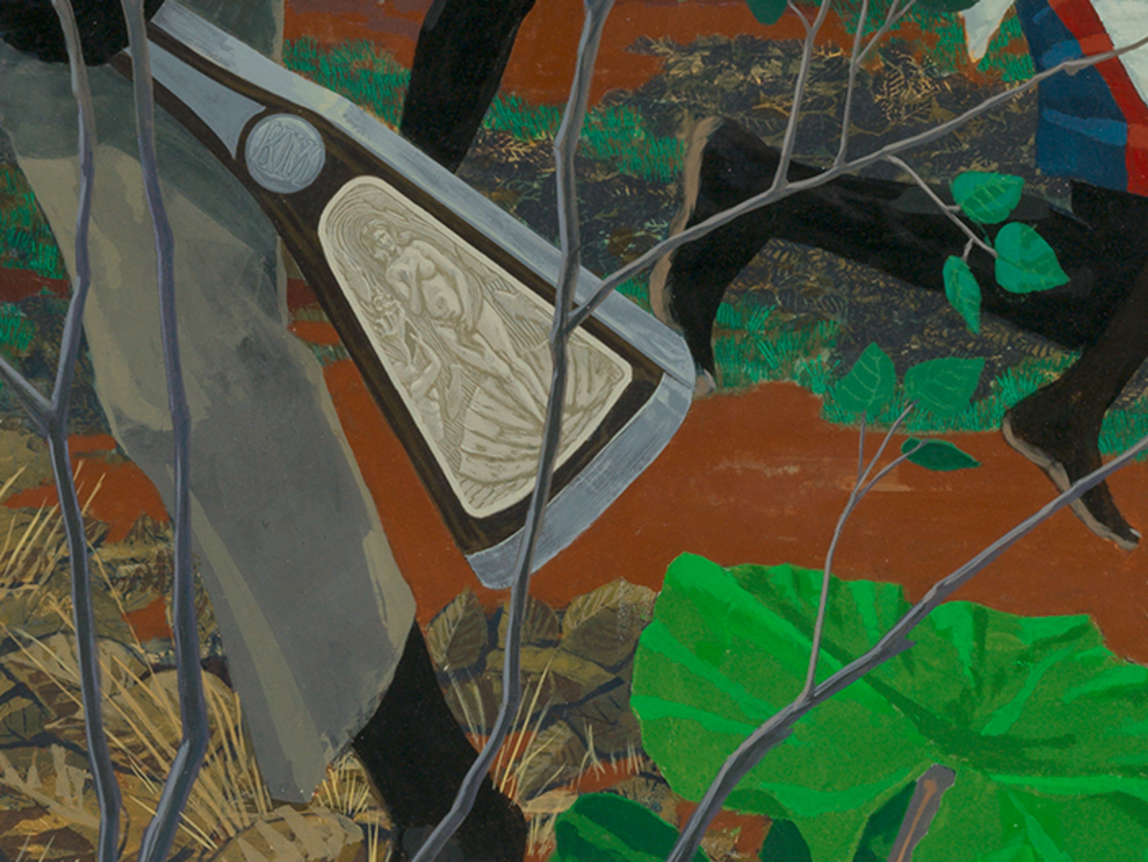 In Abduction of Olaudah and his sister, Marshall imagines the abduction of Olaudah Equiano (c. 1745–1797) and his sister from their village of Essaka, located in present-day Nigeria, a real-life event that took place when Equiano was around the age of eleven. After being transported to the Caribbean, where he was sold into slavery in the Americas, Equiano eventually gained his freedom in 1766. He became a well-known writer and abolitionist in London, where he settled as a freedman. Equiano went on to detail his abduction in his 1789 autobiography, The Interesting Narrative of the Life of Olaudah Equiano, which became a key text in England’s burgeoning abolitionist movement, of which he was a leading figure; the book remains an important primary source from this period. In the painting, the kidnapping is partially obscured by foliage—“a matrix placed to sew us into the view, a veil set to heighten care in observation,” as Darby English notes in the exhibition catalogue. The lush surroundings, with birds and monkeys roaming freely through the branches, stand in direct contrast to the nefarious act happening within. The perpetrators are dressed anachronistically in modern clothing, suggesting the continued occurrence of such events. Their hands are clamped over the children’s mouths, literally silencing them. In the center of the composition, a shirtless man stands wielding a rifle on which Marshall has included an elaborate ivory carving that replicates the titular figure from Botticelli’s The Birth of Venus. Just above, Marshall has affixed his own monogram to the gun’s medallion, to again make visible his authorial presence and subjectivity. As English suggests, the artist does this in order to “to fuse his action with the slavers’ grandiose shows of force, which at once signal the fragility of their operations and flex the muscle reinforcing those operations against threats from similarly opportunistic competitors.”