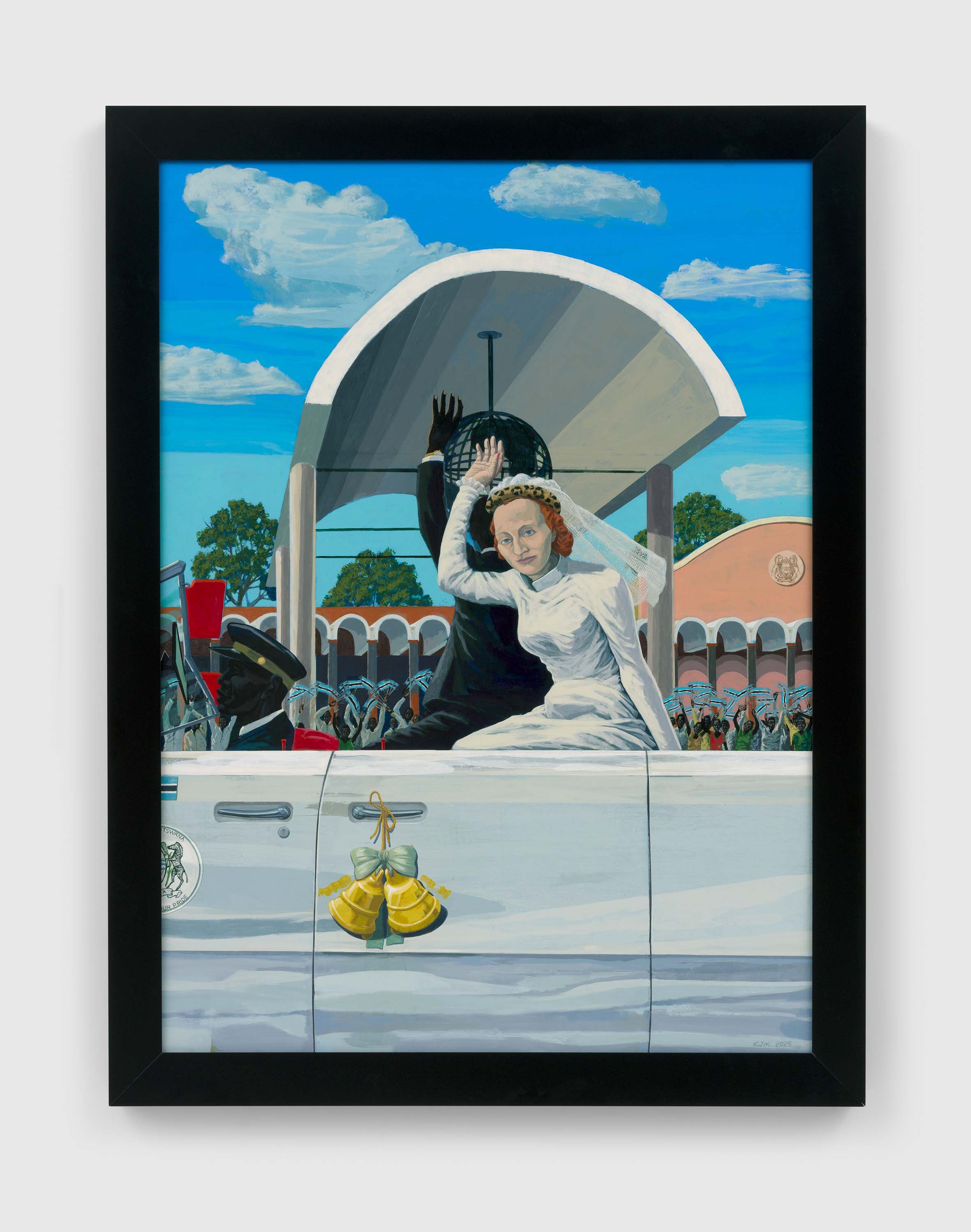 One of two White Queens of Africa paintings on view, Ruth is the imagined wedding portrait of Ruth Williams (1923–2002), a white Englishwoman who upon her 1948 marriage to Seretse Khama (1921–1980), a prince of the Bamangwato people in a then-British protectorate called Bechuanaland (now known as Botswana), became the First Lady of Botswana from 1966 to 1980. Khama was educated in the UK, where he met Williams, who was working as an insurance clerk, and the two quickly fell in love. Their marriage caused an international uproar. The white-minority government of neighboring apartheid-era South Africa opposed the interracial union and asked the UK to intervene. Likewise, some Bamangwato tribal elders were dismayed their prince and heir apparent chose an outsider (though Khama was able to allay their concerns). In response to pressure from South Africa—at the time still a member of the British Commonwealth—the UK held Khama in exile in England for nearly a decade. When he eventually returned, Khama led his country’s drive for independence, becoming prime minister in 1965 and being elected as Botswana’s first president one year later. Khama was a transformative leader, ushering the country into a period of stability and prosperity, while Williams established herself as a respected and influential figure. In the artist’s rendition, Williams rides through the capital city, Gaborone, atop a white convertible that bears Botswana’s coat of arms. The recognizable arches of the country’s National Assembly, the seat of its democratic government, are visible in the background. Waving to the assembled crowds, Williams is dressed in an English-style bridal gown, which is contrasted by a leopard headpiece. She gazes directly at the viewer, her body partially obscuring her new husband, who faces away. Khama, also dressed in Western clothing, greets well-wishers, who wave the light blue, black, and white of Botswana’s new flag. As elsewhere in this series, this composition is replete with anachronisms—in this case, to underscore the inherent symbolism, and maybe even irony, of Williams’s position. In real life, Williams and Khama were so beset by scandal that they married quietly in a register office in London; the Botswana coat of arms and flag were not actually adopted until the country gained independence eighteen years later. And in choosing to feature Williams—as opposed to her husband, a notable figure in African history—Marshall shifts focus to the presence of “the white queen” during the early days of postcolonialism in Africa.