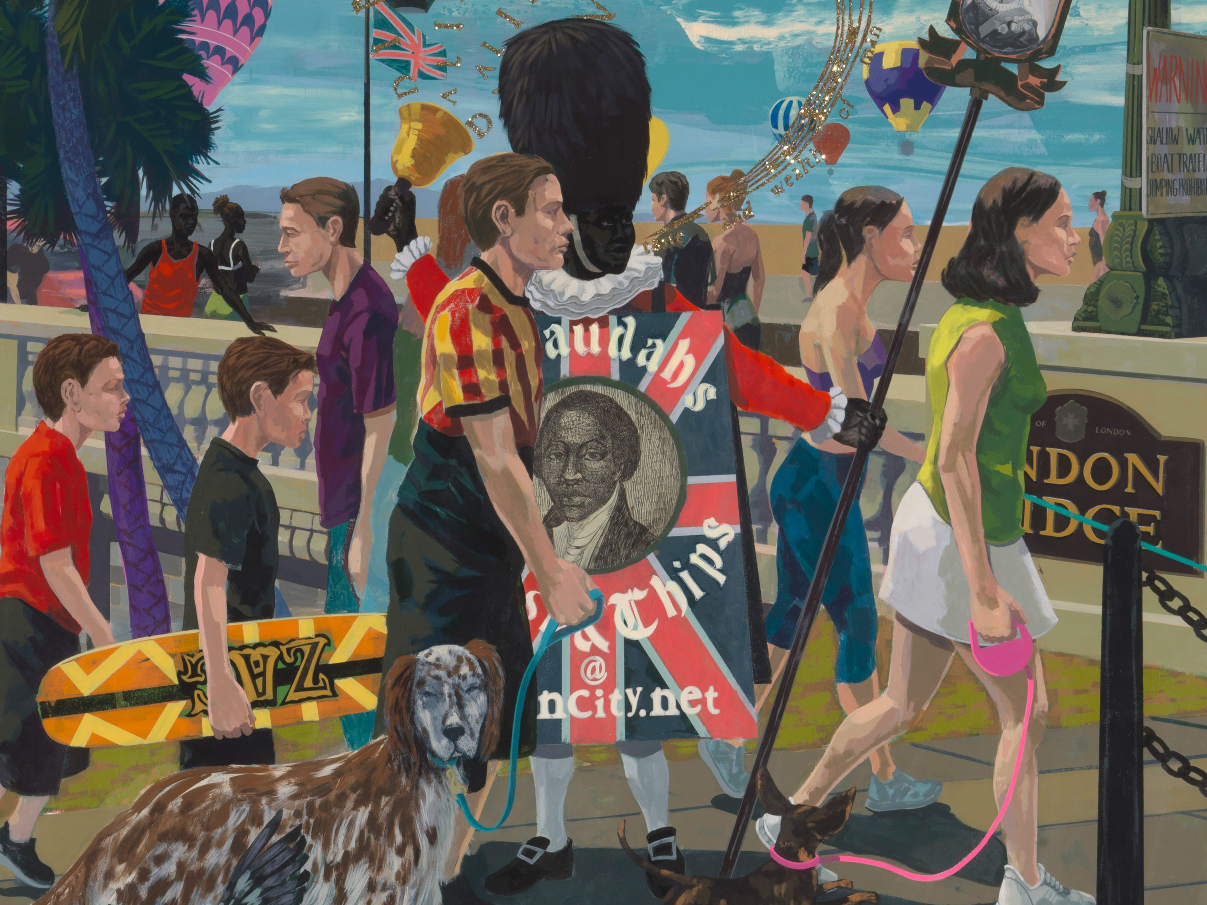 The figure of Olaudah Equiano first appeared in Marshall’s oeuvre in the 2017 painting Untitled (London Bridge), which depicts the London Bridge after it was reconstituted in Lake Havasu City, Arizona, moved there brick-by-brick as a novelty tourist attraction in 1971. In this painting—a rare instance of the artist foregrounding white figures within a composition—a Black man dressed in British paraphernalia wears a sandwich board advertising “Olaudah’s Fish & Chips,” which features a portrait of Equiano based on the frontispiece of his autobiography. In embedding this reference within the painting, Marshall draws a parallel between the Bridge and Equiano, both displaced from their original context and reabsorbed into the cultural imagination.