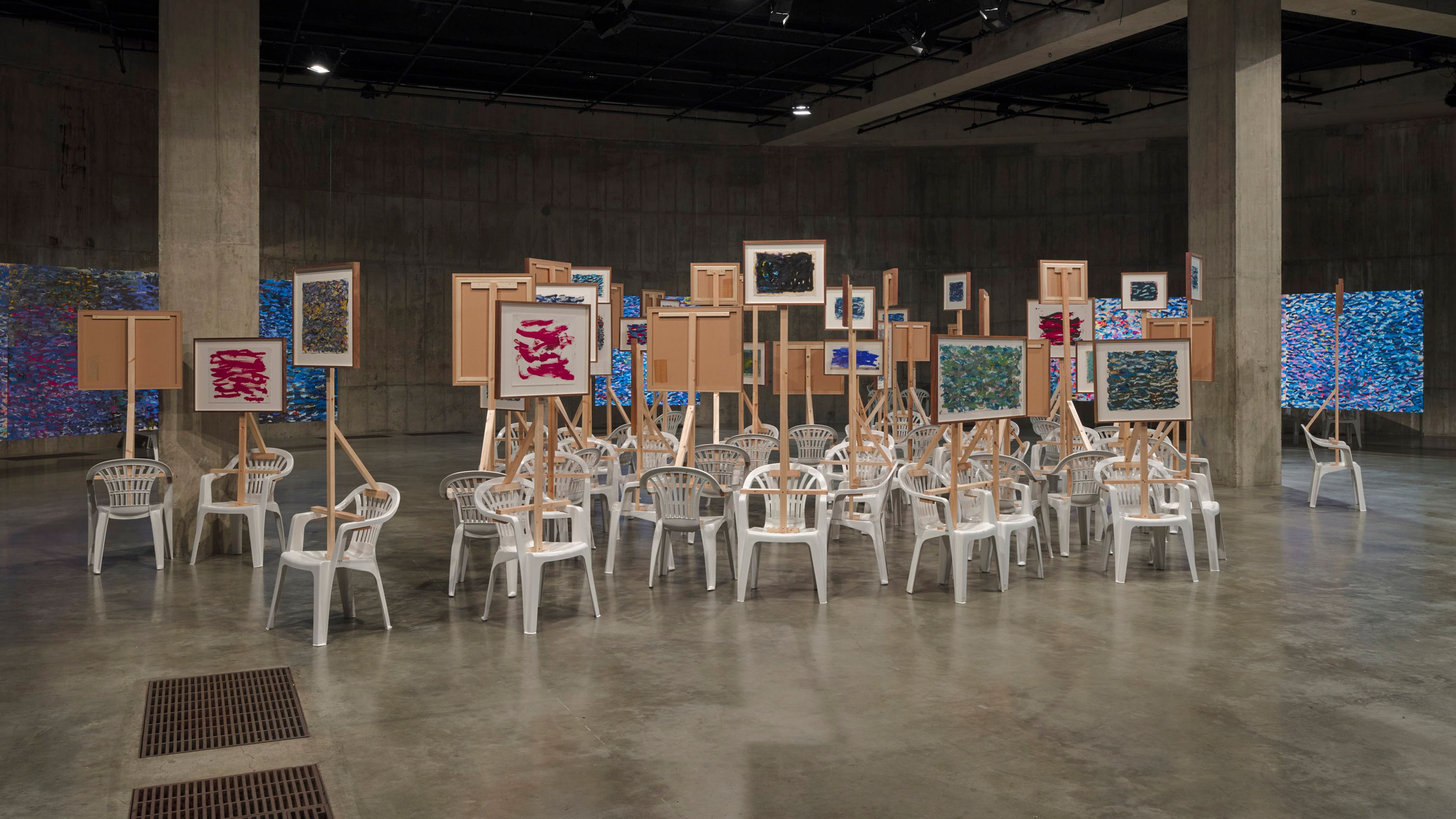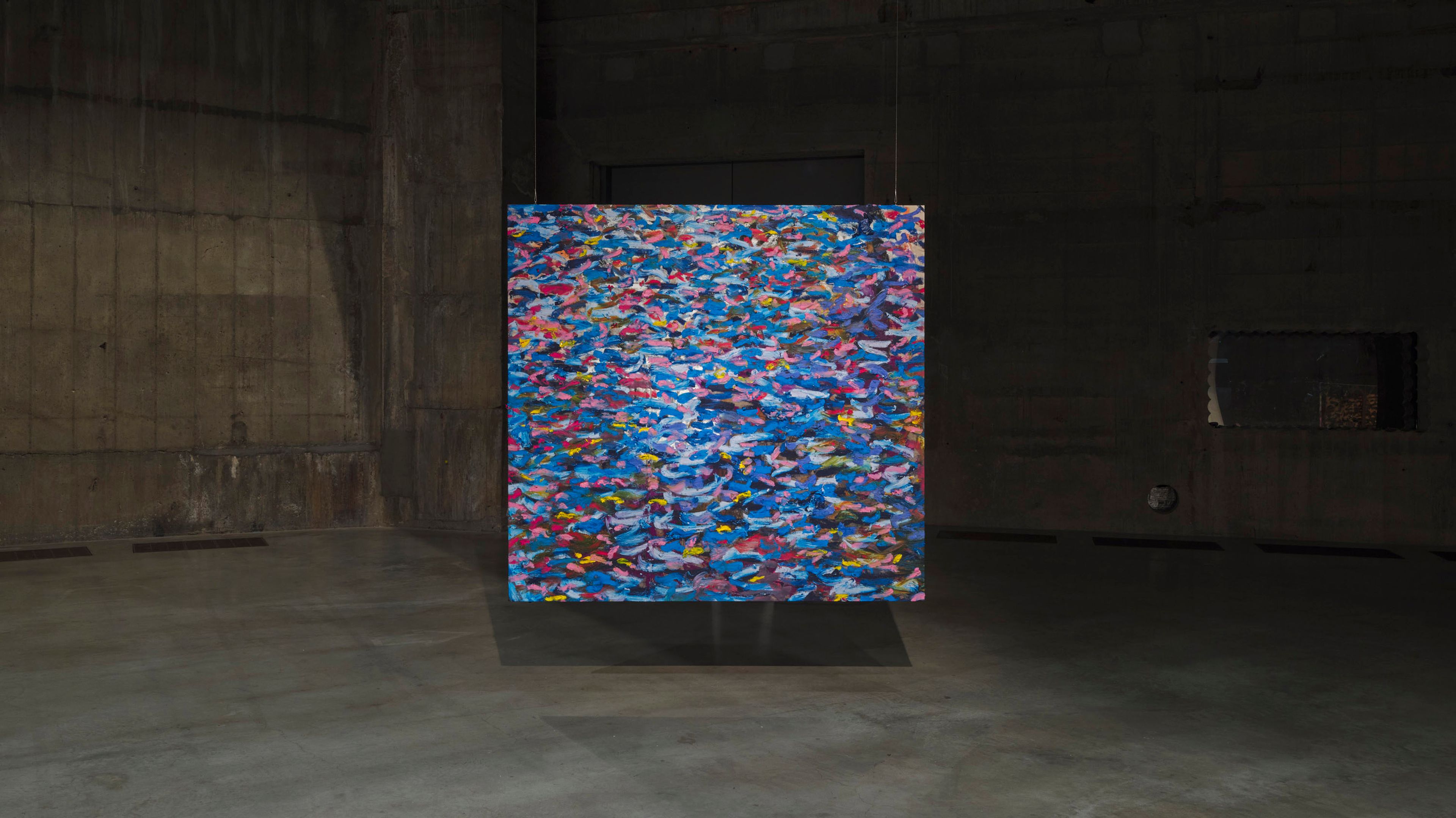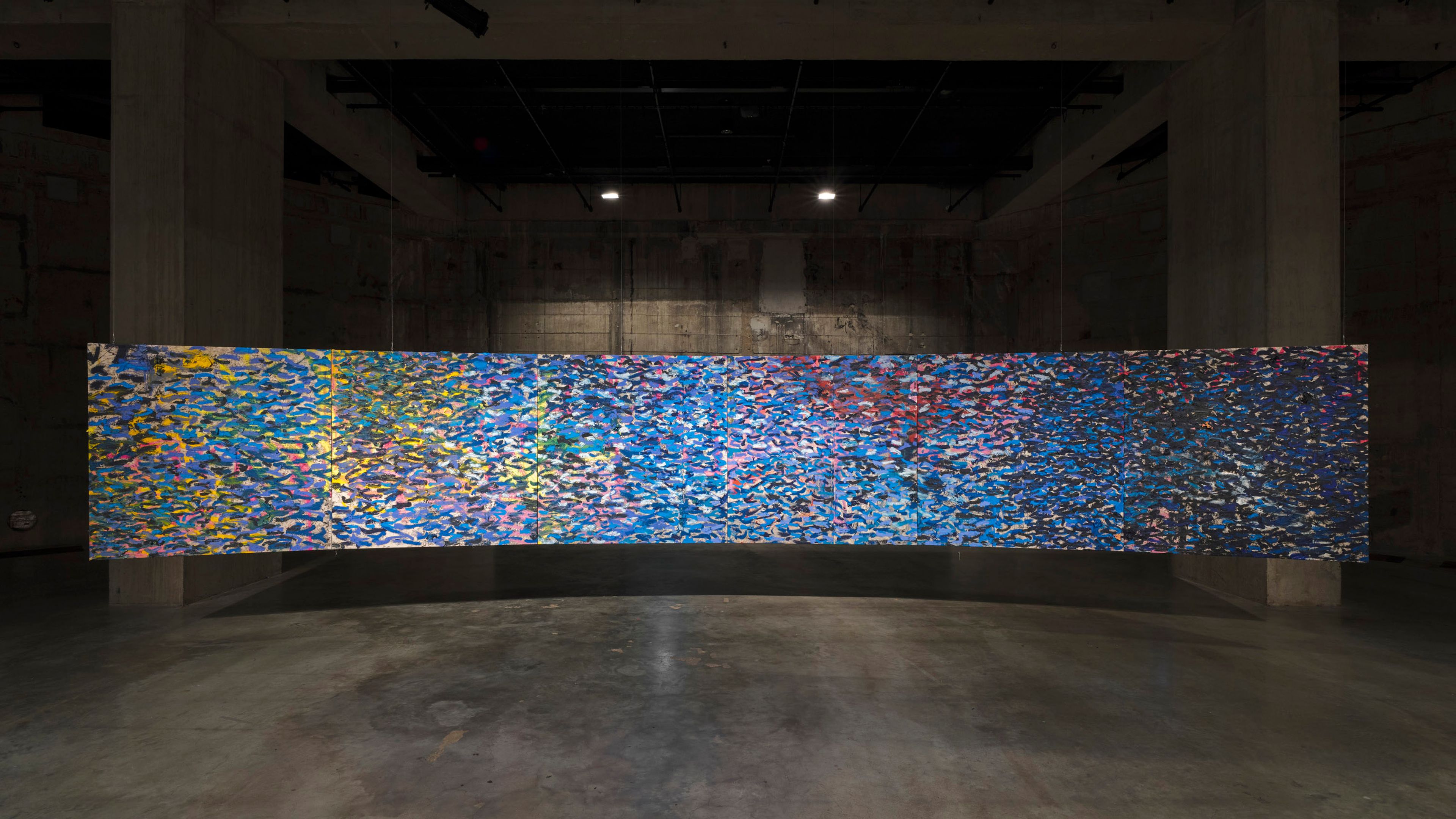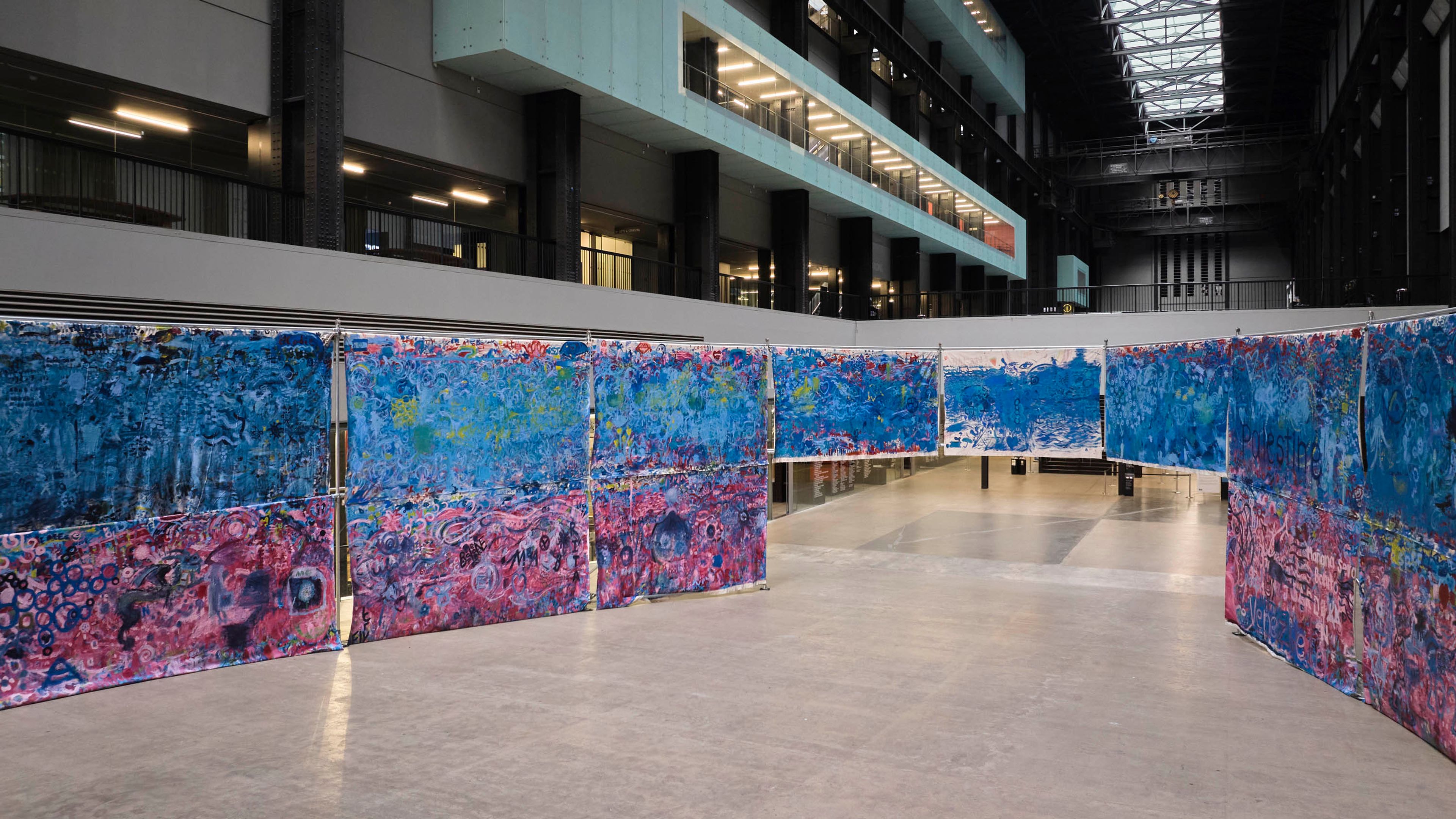 Oscar Murillo transformed the Tate Modern’s Turbine Hall into his installation The flooded garden. The work’s gestural oil paint strokes flowed cyclically around the space, mirroring the curved interactive structures in the Turbine Hall. The presentation also extended into the Tate's South Tanks, where a survey of Murillo's ongoing Surge series over the years was exhibited.