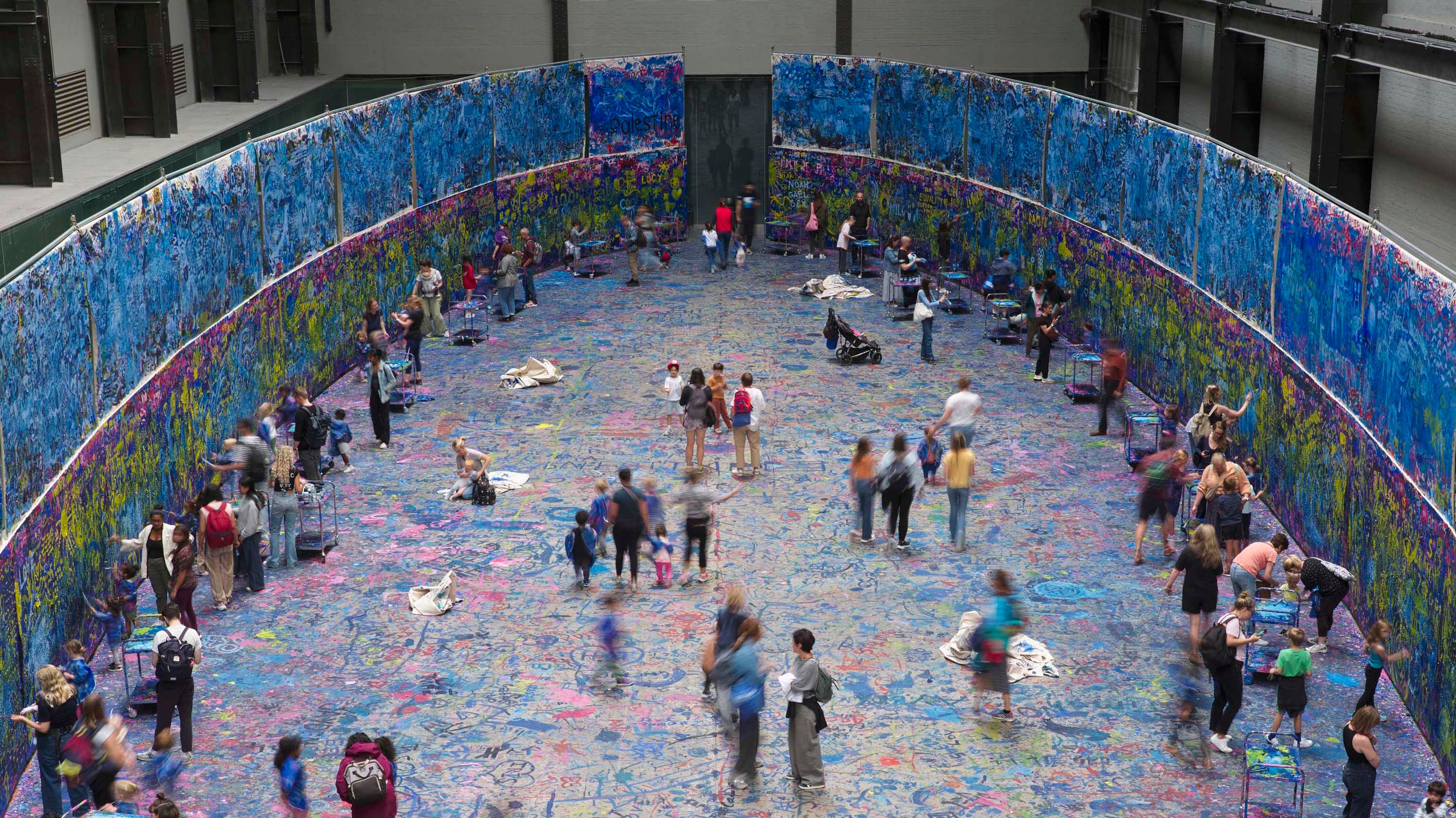 The installation The flooded garden took inspiration from Claude Monet’s Water Lilies series and the garden in which he painted them. Visitors were invited to paint water and waves onto a monumental wall of canvas, creating a layered, collaborative painting of epic proportions. Ahead of the opening, Murillo collaborated with others to load blank canvases with words and sentences that reflect individual experiences and concerns. This formed the first layer of the painting, over which the public’s wave-like, gestural brushstrokes were added to create The flooded garden. Murillo often creates works which bring people together. At Tate Modern, visitors were invited to get involved in the energizing process of mark-making, creating multiple large-scale collaborative artworks inspired by Murillo’s pieces.