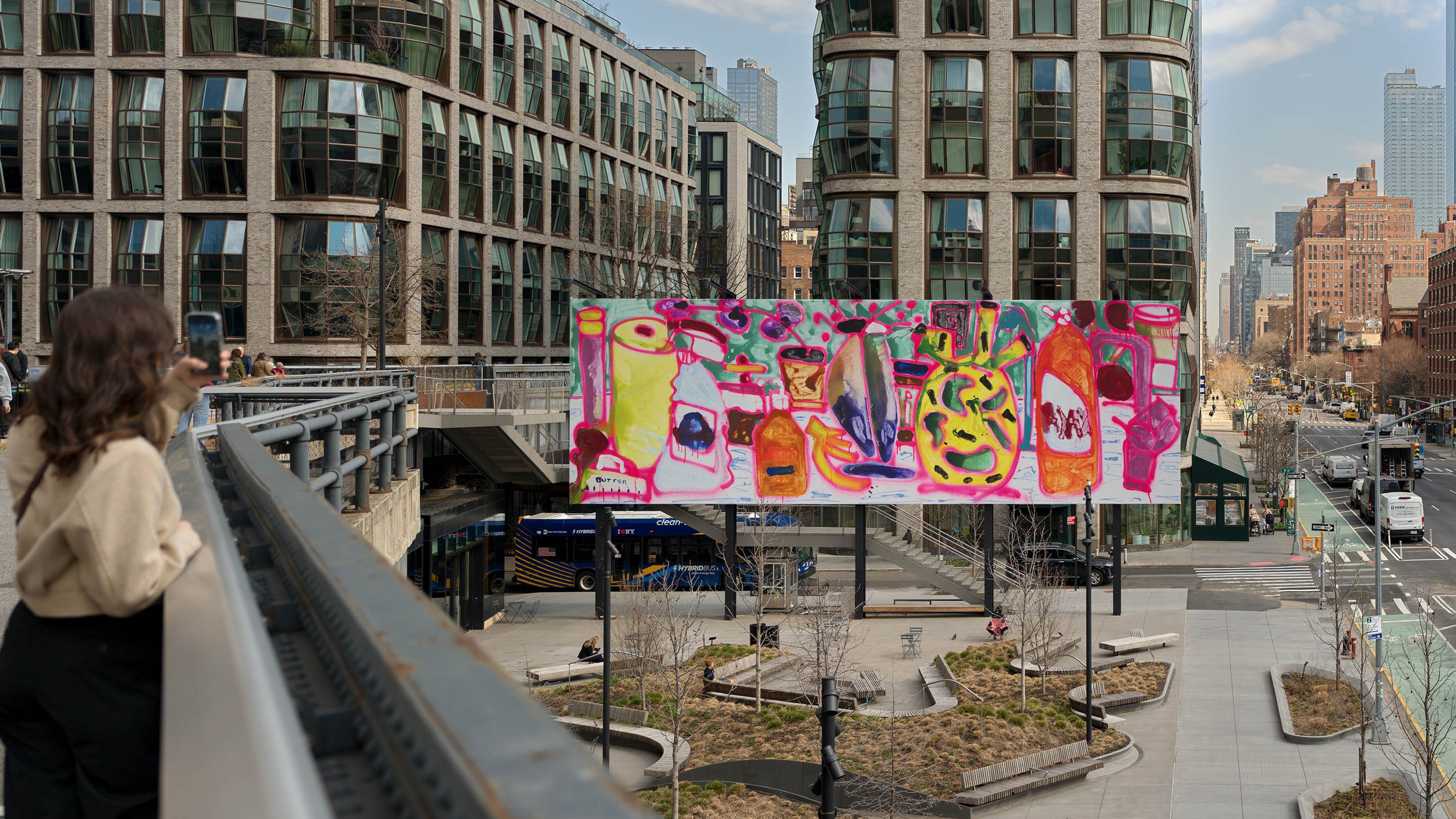 For the High Line’s 18th Street Billboard, Katherine Bernhardt presents Spring Cleaning, a painting of a vivid, crowded still life that stages an encounter between domestic labor, consumer goods, and everyday ritual. Cleaning supplies such as paper towel rolls, glass cleaner, Ajax, and dish soap sit atop a packed white kitchen counter alongside bananas, a pot of purple orchids, a stick of butter, a to-go coffee cup, and a fuchsia sink faucet. Rendered in Bernhardt’s signature palette of bright color and assertive brushwork, the composition is unified by a bright pink spray-painted outline, a recurring gesture in her practice. The familiar objects hover between order and chaos, utility and excess. On view in the spring on the High Line, the work resonates with seasonal rituals of renewal while reflecting the challenges of maintaining order within a culture shaped by constant consumption and accumulation.