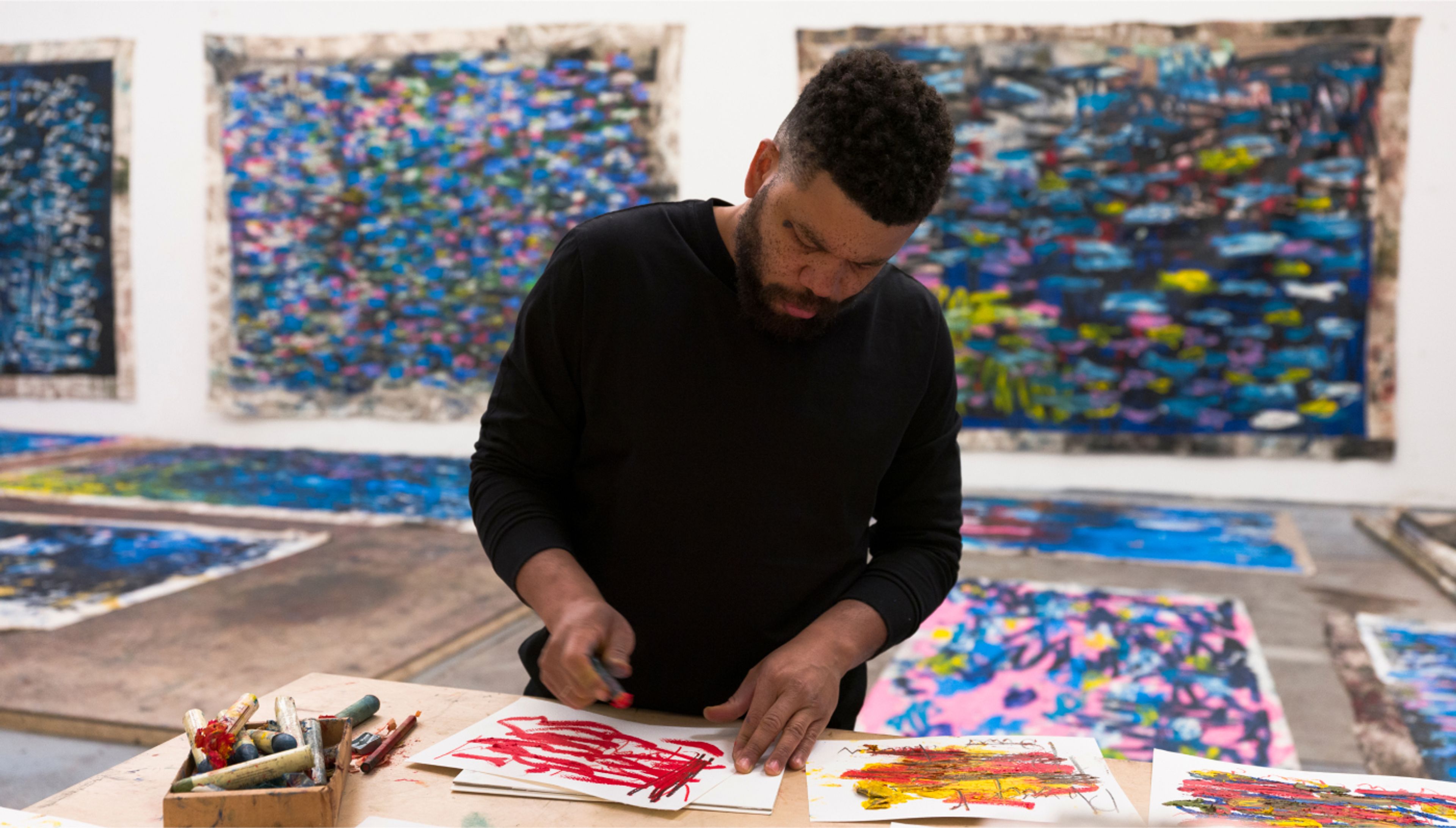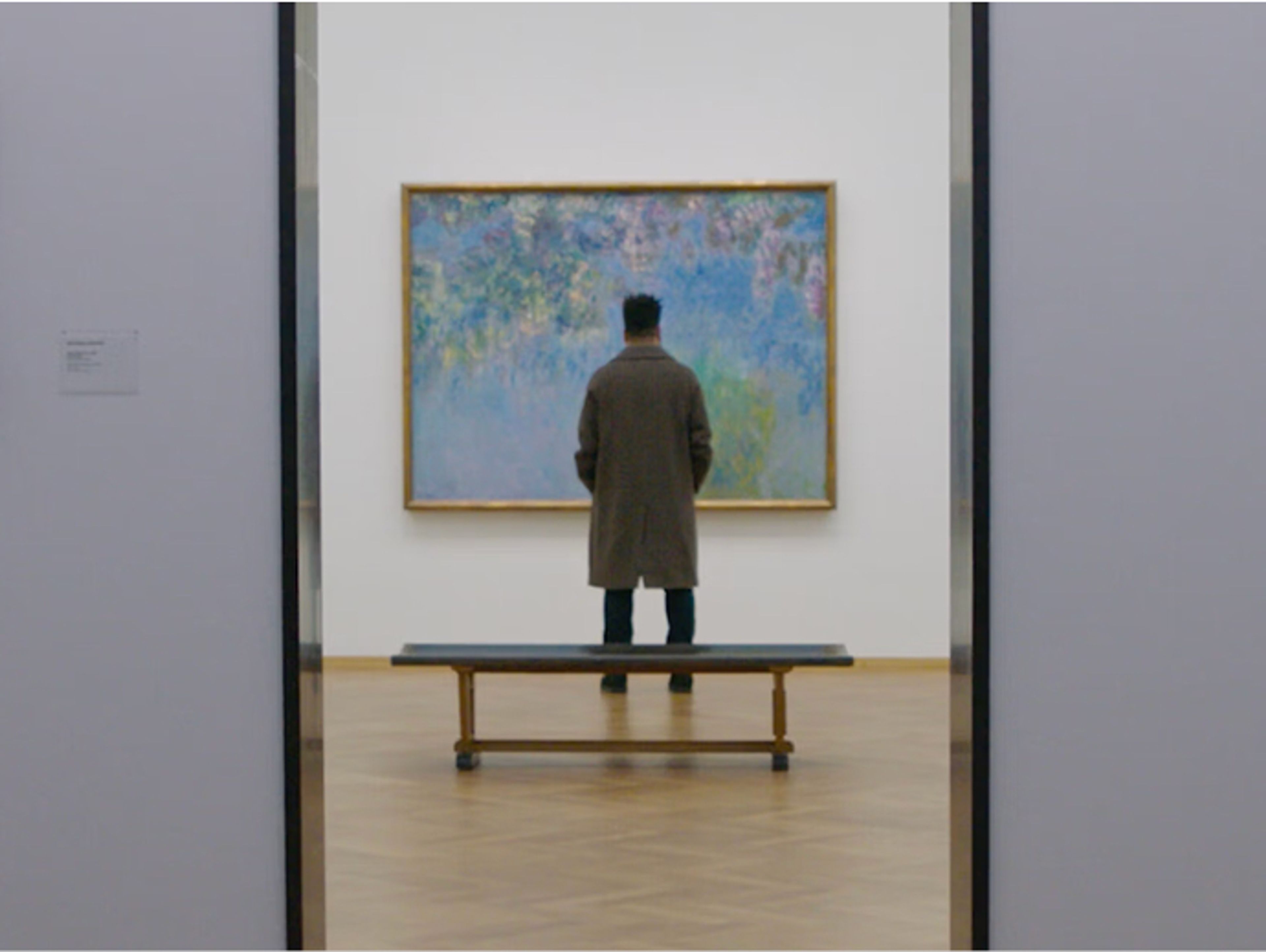 Oscar Murillo in front of one of Monet’s Water Lilies. Still from video by Woestwerk. Courtesy KM21, The Hague, Netherlands