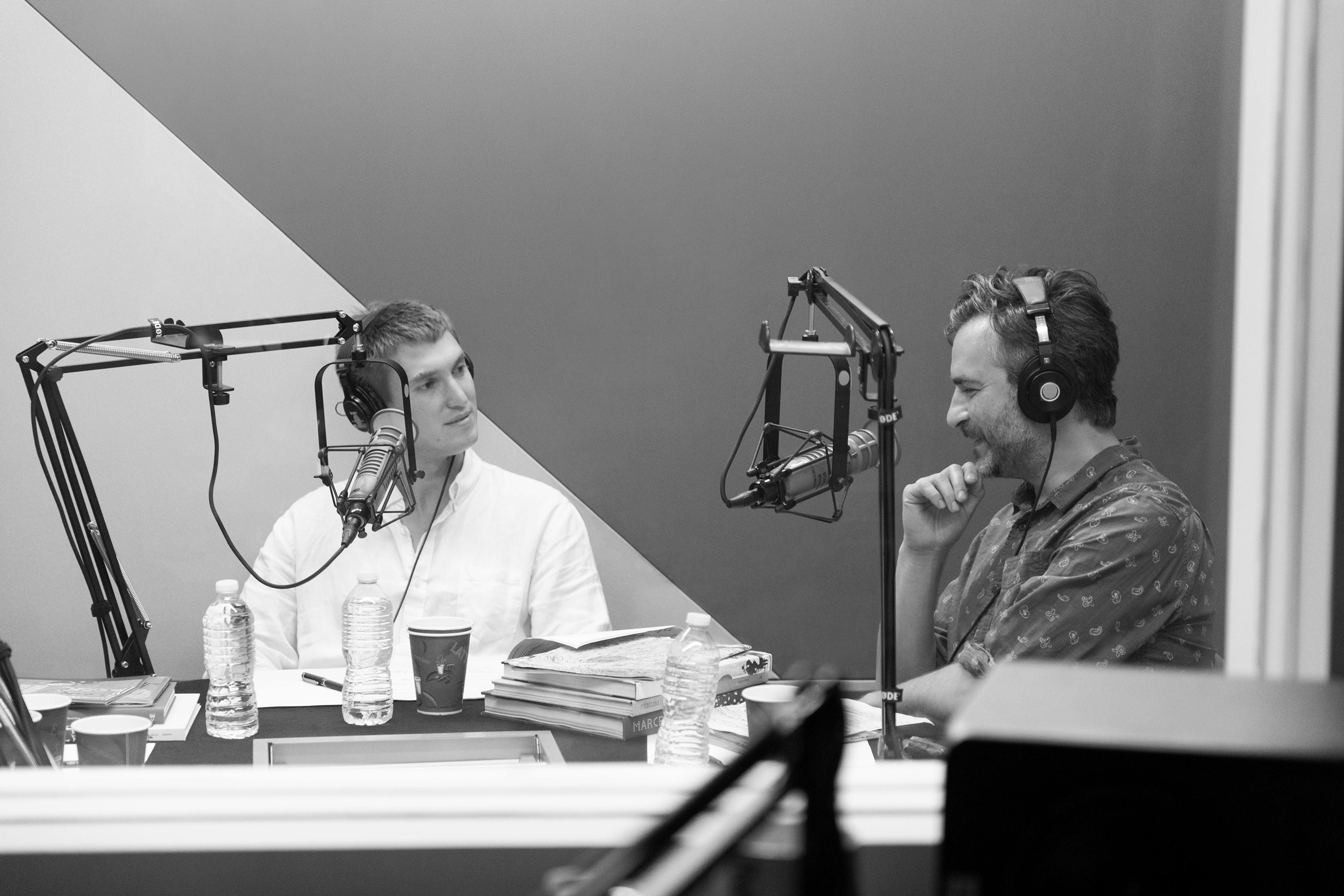 Lucas Zwirner and Marcel Dzama in the podcast studio, 2018. Photo by Alex Casto