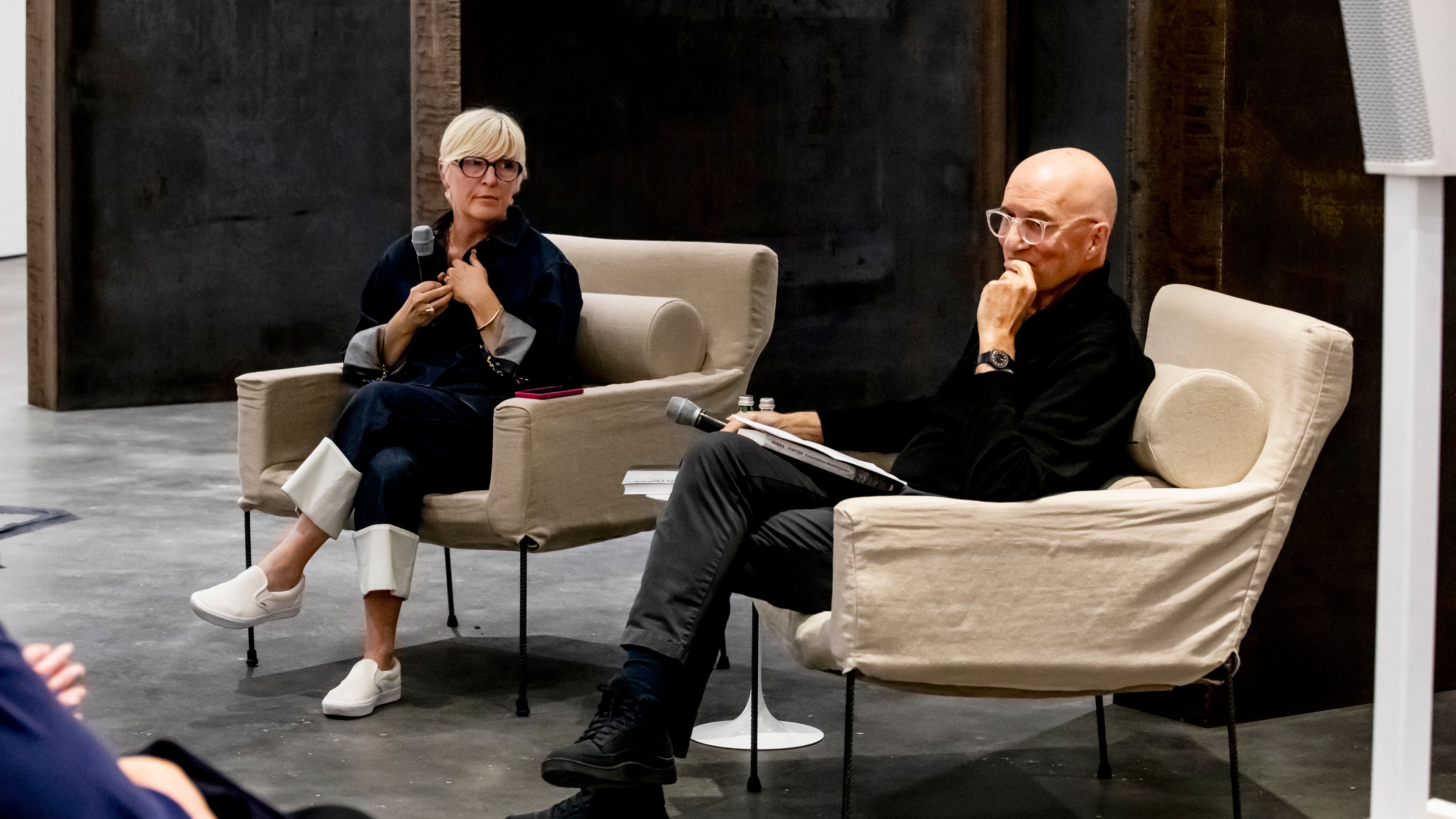 Helen Molesworth and Hal Foster in conversation for a Richard Serra Live Podcast Taping, 2024. Photo by Krista Schlueter