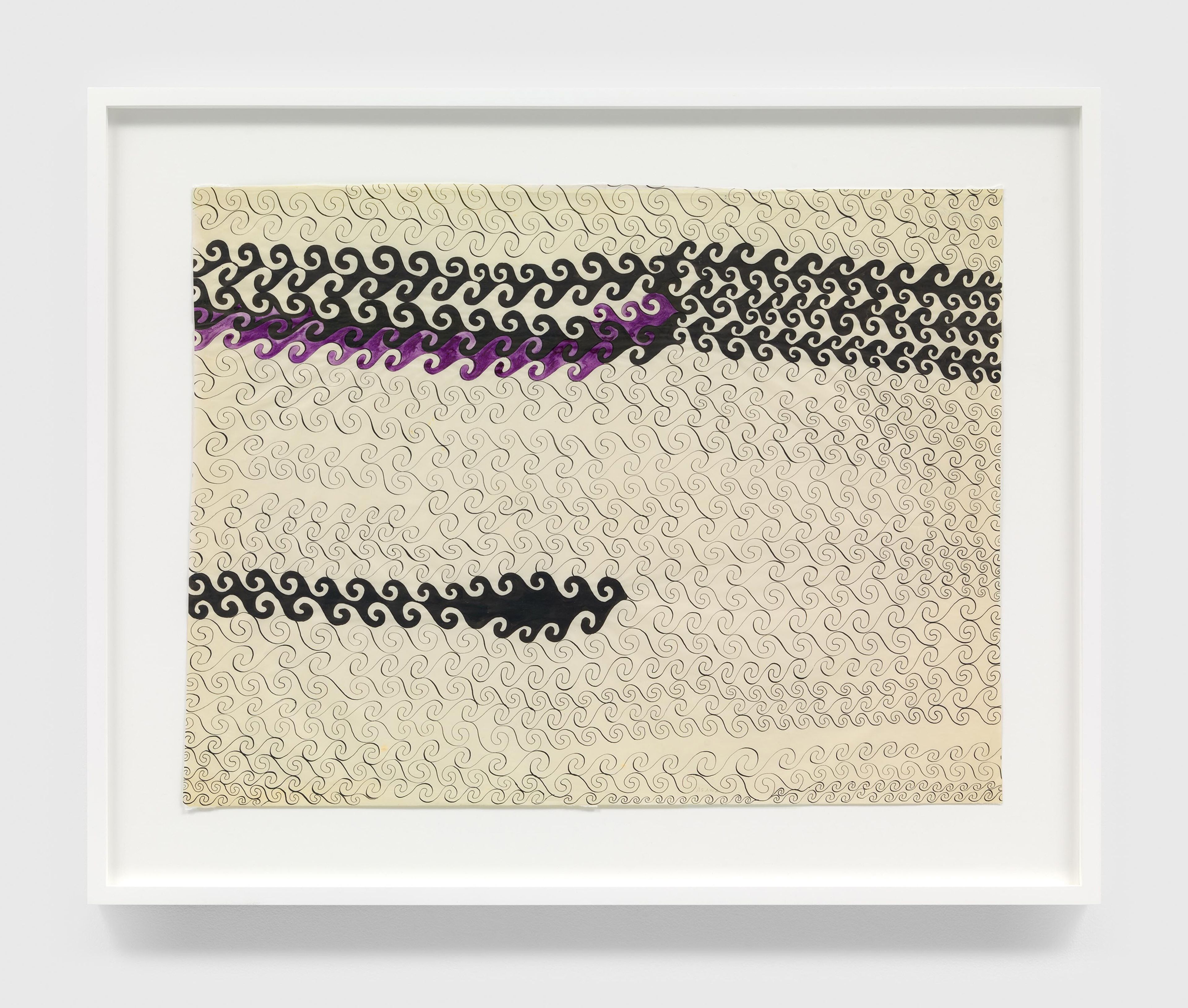Along with wire sculptures, the presentation of works made by Asawa at Black Mountain College in A Retrospective includes collages, prints, and drawings such as Untitled (BMC.58, Meander - Curved Lines), c. 1948 (above). Artworks © 2025 Ruth Asawa Lanier, Inc.