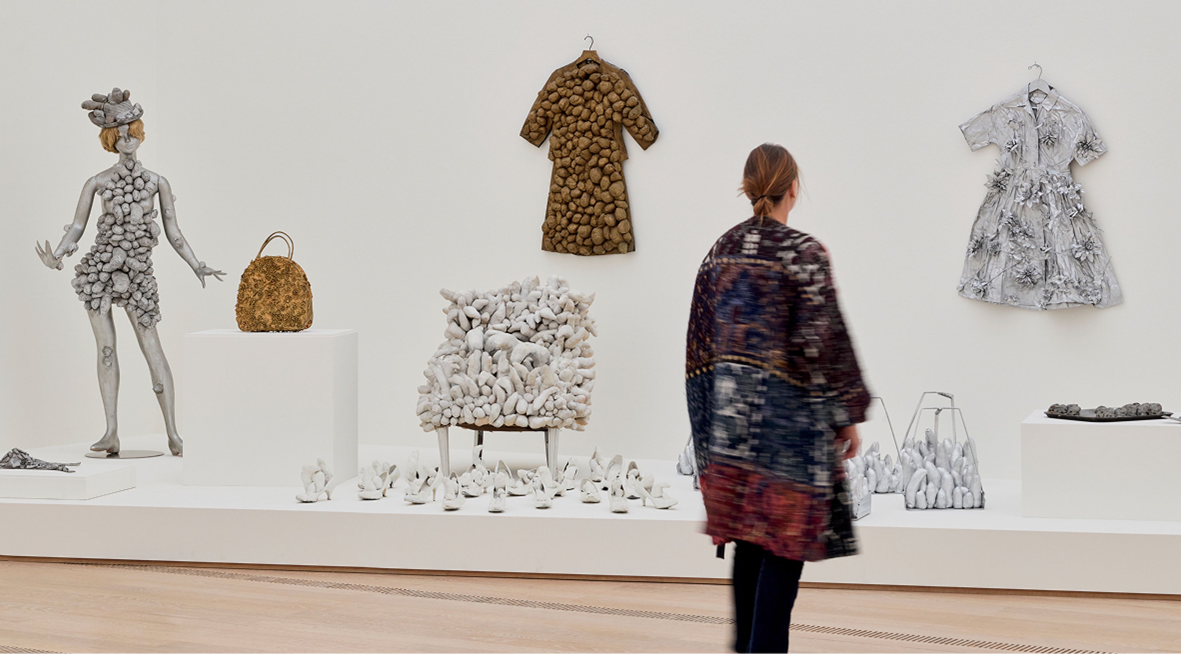 In December 1963, Kusama had another breakthrough with her installation Aggregation: One Thousand Boats Show at the Gertrude Stein Gallery in New York. A single rowboat was placed in the center of the room, while the walls were covered with 999 black-and-white reproductions of the boat sculpture. The rowboat featured Kusama’s now signature soft phallus-like fabric forms—an invention that led to her Accumulations sculptures and, as the catalogue introduction explains, was “an effort to confront her phallic anxieties and her aversion to sex in a typically excessive manner.” During these eventful years in New York—when Kusama was involved in the underground art scene and became known for her public performances and Happenings that dissolved the boundaries between art, society, and our environment—one work produced abroad stands out among others. Narcissus Garden represented Kusama’s unofficial participation in the Venice Biennale, in 1966; despite not being invited to present work in the exhibition, she created an arrangement of hundreds of chrome-plated balls on a lawn, which reflected the surroundings, the people, and the architecture. Narcissus Garden was made in reference to the Greek myth of the beauty who falls in love with his own reflection, and Kusama laid in the grass among the spheres and offered individual balls for sale with the pitch: “Your narcissism for sale: one piece 2 dollars.” This artwork represents Kusama’s careerlong project to bring the viewer into her work through participatory elements.