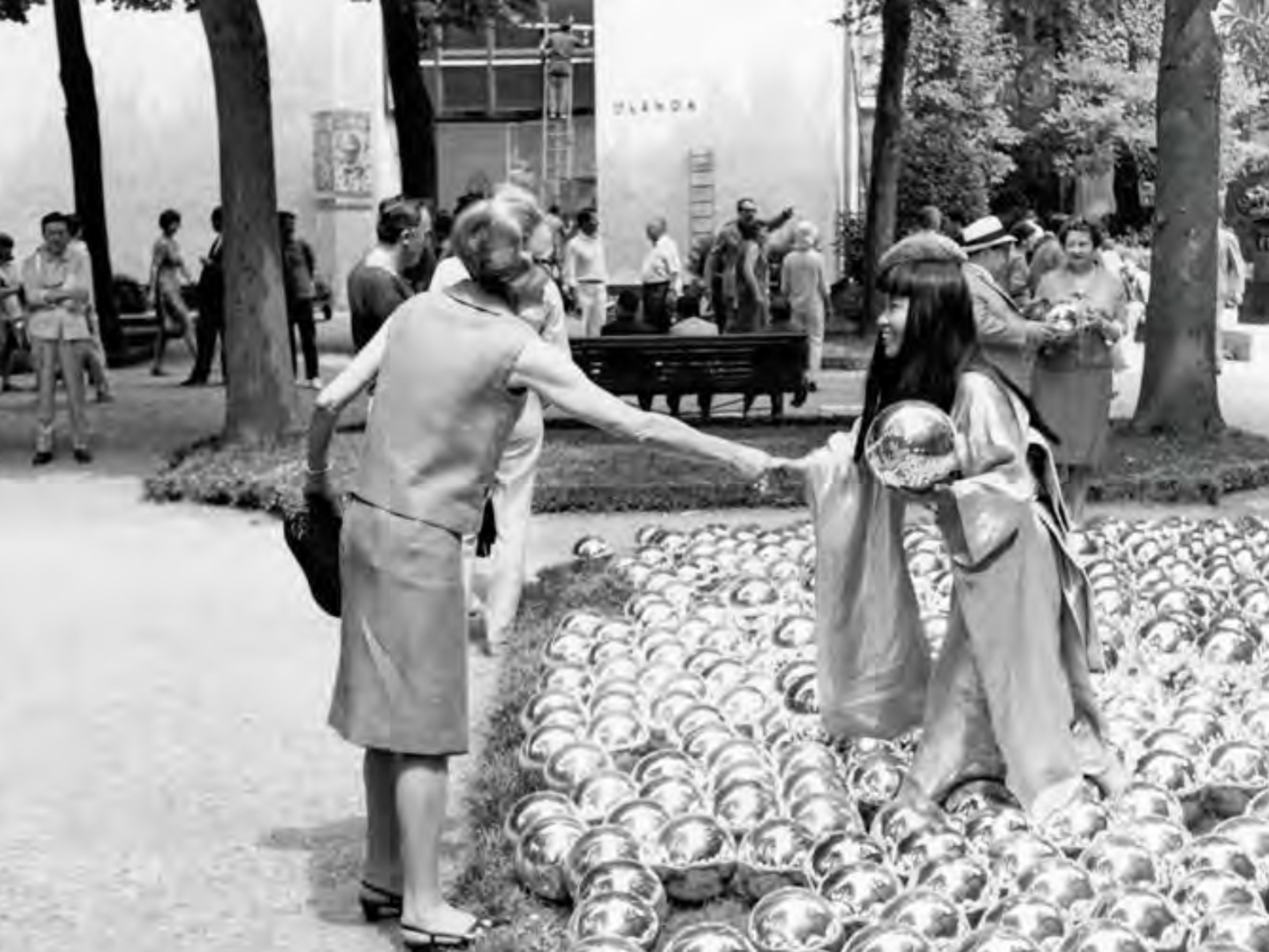 Kusama interacting with a visitor to Narcissus Garden (1966), at the 33rd Venice Biennale. © YAYOI KUSAMA. Ota Fine Arts, Tokyo/Singapore/Shanghai; Victoria Miro, London/Venice